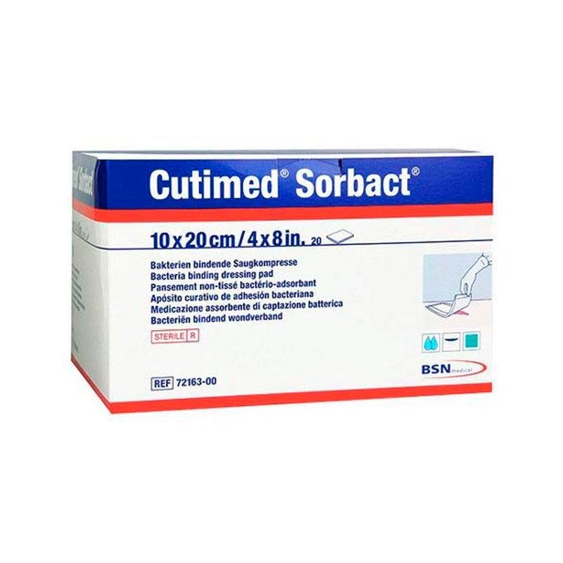 Apósito Cutimed Sorbact estéril para el tratamiento de heridas infectadas o contaminadas con exudado entre moderado y abundante. Mediante el principio de la hidrofobia, ejerce su exclusiva acción captadora de microorganismos para eliminar las bacterias y los hongos de la herida. Así, con cada cambio de apósito, se reduce la carga bacteriana de la zona y se crean las condiciones óptimas para el proceso natural de cicatrización.